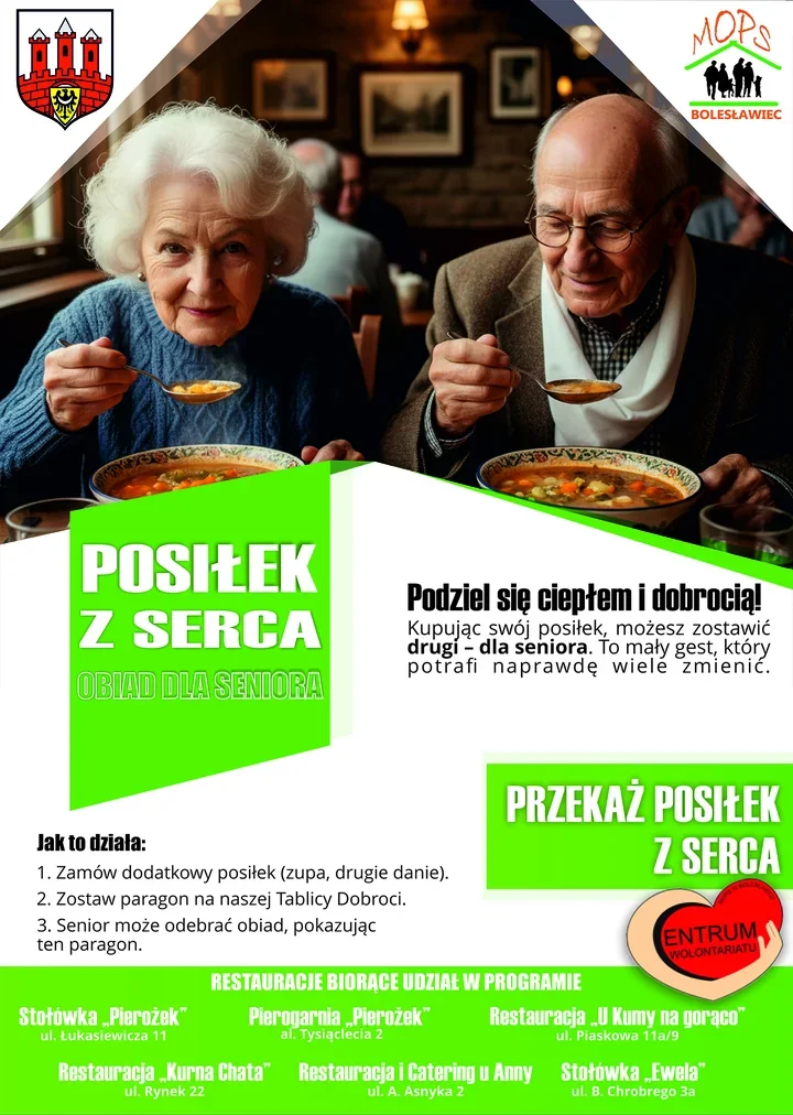W akcji „Posiłek z serca” schemat jest prosty i nie wymaga żadnych formalności. Klient zamawia dodatkowy obiad, zostawia w restauracji paragon na Tablicy Dobroci, a senior może później odebrać ciepły posiłek, pokazując ten sam dowód. W efekcie pomoc nie rozmywa się po drodze, tylko trafia dokładnie tam, gdzie jest potrzebna.