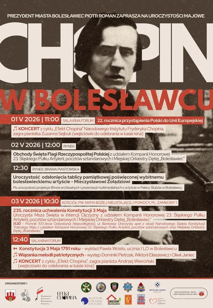 W Bolesławcu majówka nie rozegra się w jednym miejscu ani w jednym tonie. Najpierw zabrzmi fortepian, potem przyjdzie czas na flagę, pamięć i miejskie uroczystości, a na koniec na spotkanie z Konstytucją 3 Maja. To kilka dni, w których centrum miasta ma pulsować raz muzyką, raz historią, raz wspólnym odświętnym rytmem.